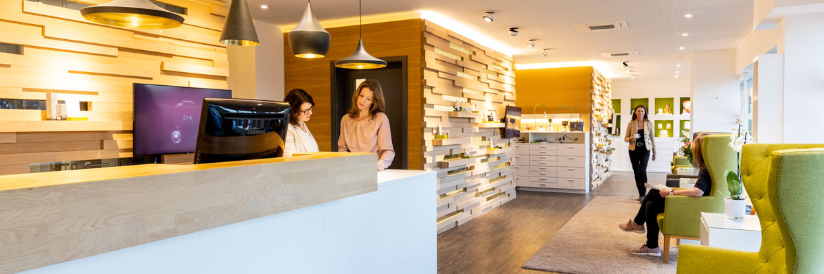 Panoramabild des HörStudios, links stehen zwei Kolleginnen hinter dem Empfangstresen, im Hintergrund findet ein Beratungsgespräch statt
