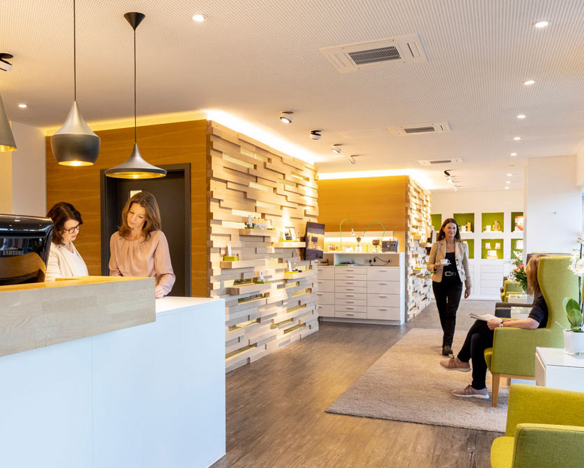 Panoramabild des HörStudios, links stehen zwei Kolleginnen hinter dem Empfangstresen, im Hintergrund findet ein Beratungsgespräch statt